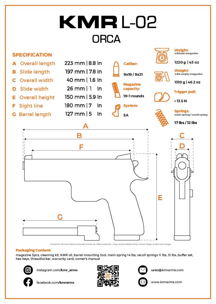 Cutie pentru pistol KMR, kit de curățare, ulei KMR, unealtă pentru montarea țevii, arc principal 14 lbs, arcuri de recul 11 lbs și 13 lbs, set amortizor, chei imbus, adeziv pentru filet, card de garanție, manual de utilizare
