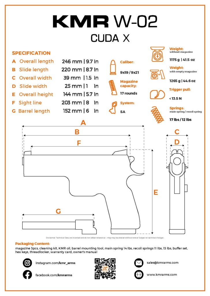 Cutie pentru pistol KMR, kit de curățare, ulei KMR, unealtă pentru montarea țevii, arc principal 14 lbs, arcuri de recul 11 lbs și 13 lbs, set amortizor, chei imbus, adeziv pentru filet, card de garanție, manual de utilizare