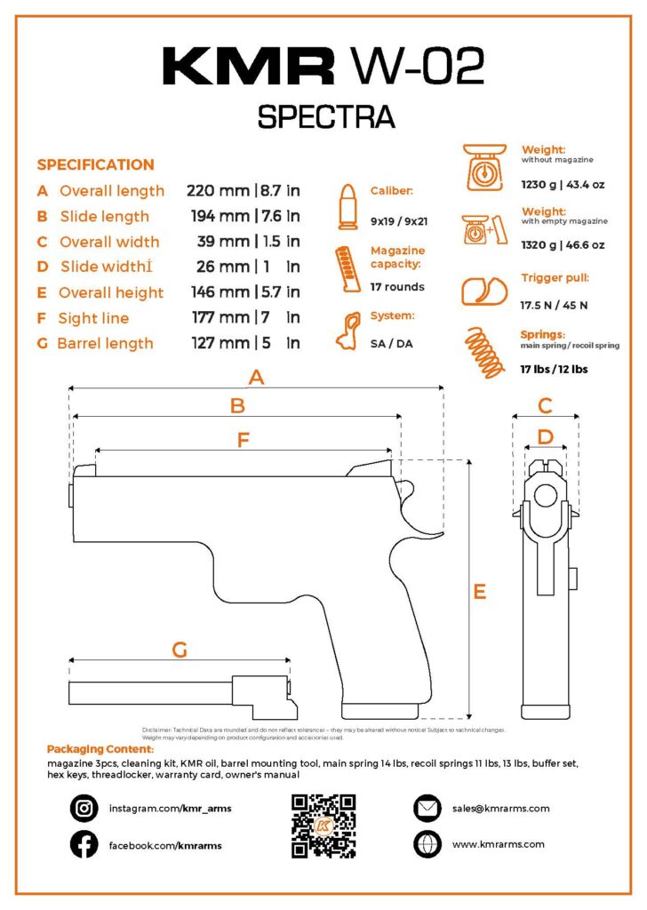 La fel ca în cazul liniei noastre standard SPECTRA, beneficiezi de precizie și de o acționare lină a trăgaciului. Arma este echipată cu stabilizare a țevii BRS, accesorii KMR, cătare spate reglabilă, cocoș de competiție și interfață pregătită pentru montarea opticii.